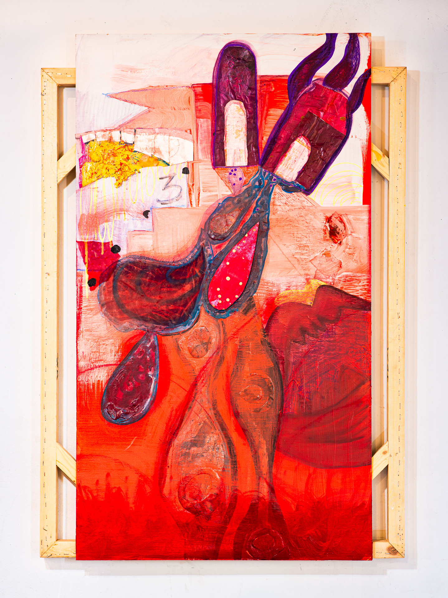 Acrylic, fabric, lottery tickets, and cardboard on panel.