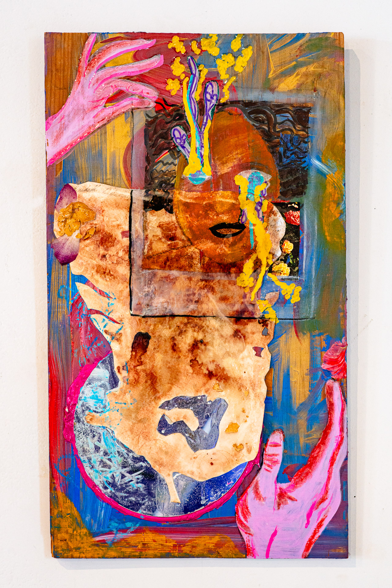 Acrylic, oil pastel, and mixed media on wood.